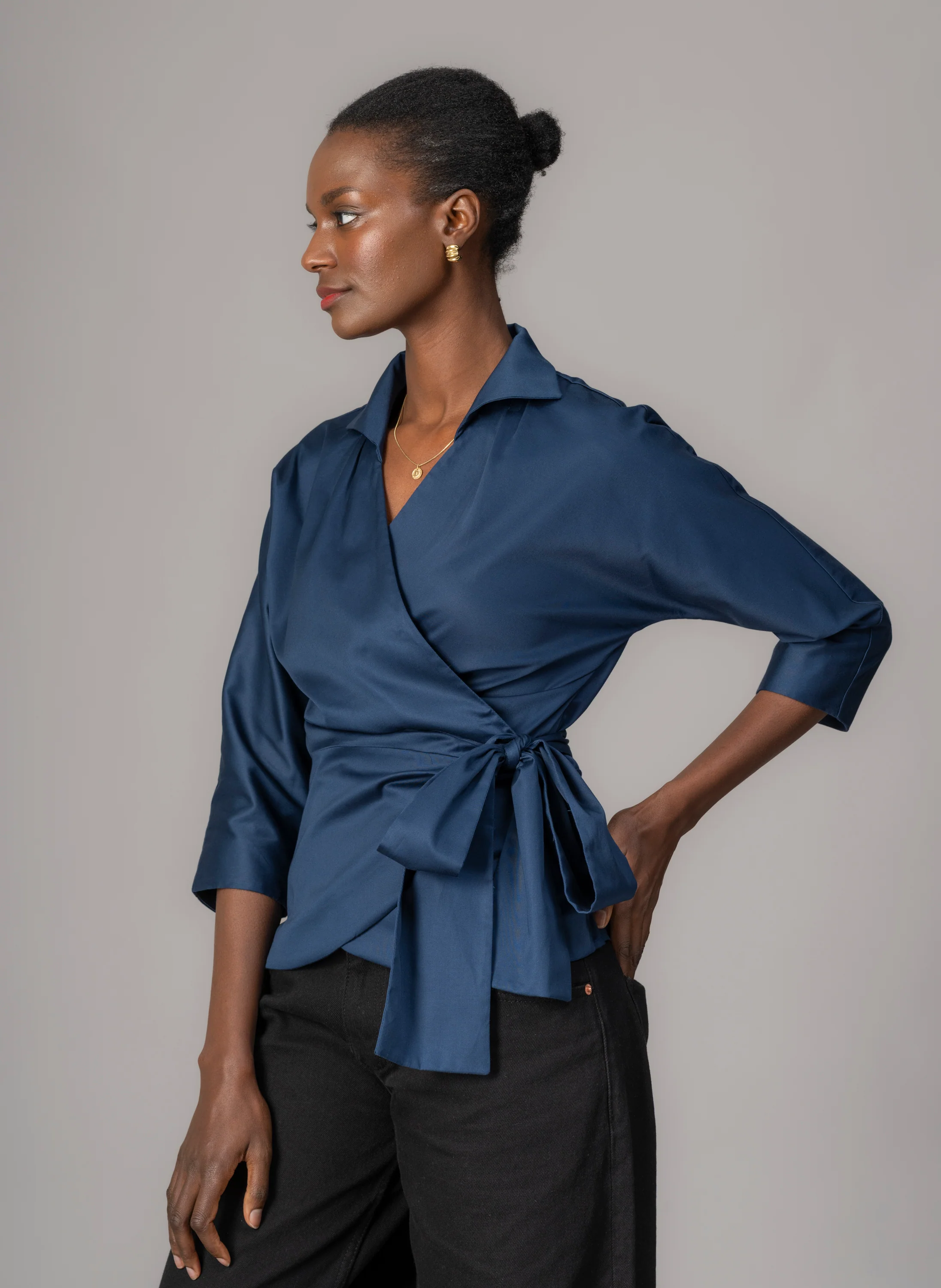 Abigail Hourglass Fit Wrap Blouse In Midnight Blue Cotton Sateen