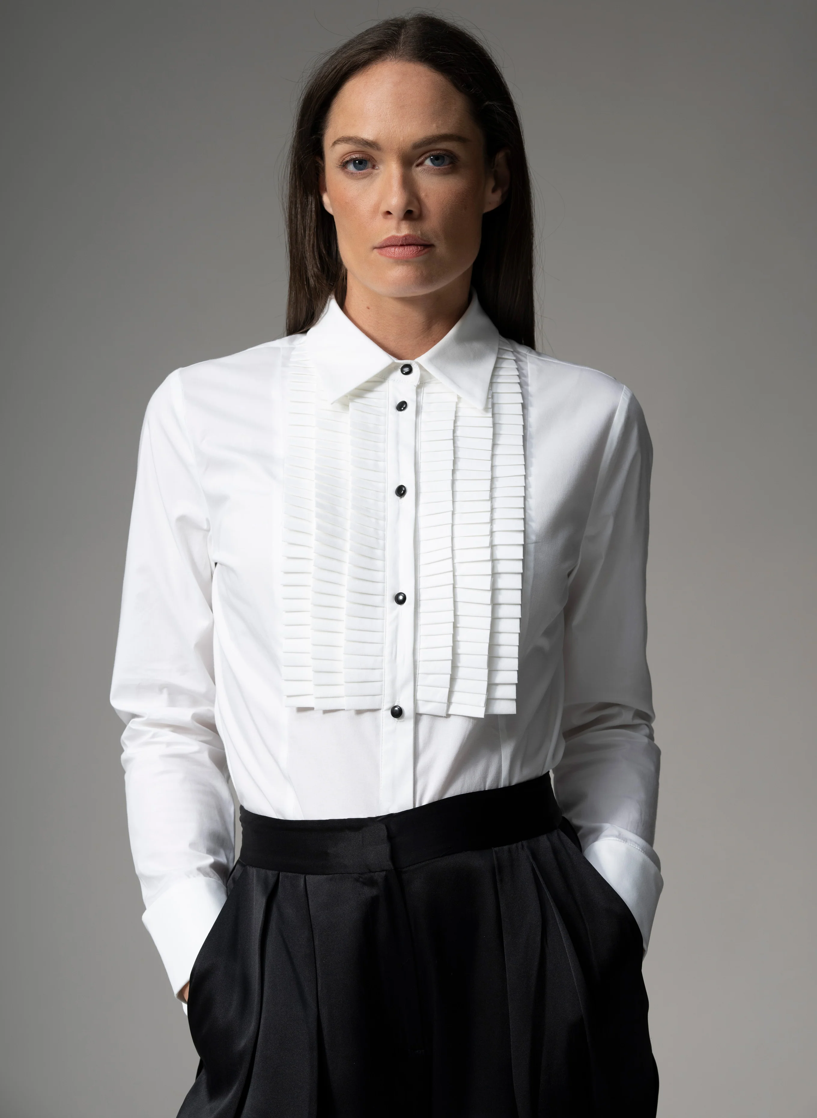Antoinette Tailored Fit Pleated Tuxedo Shirt In White Cotton Popin