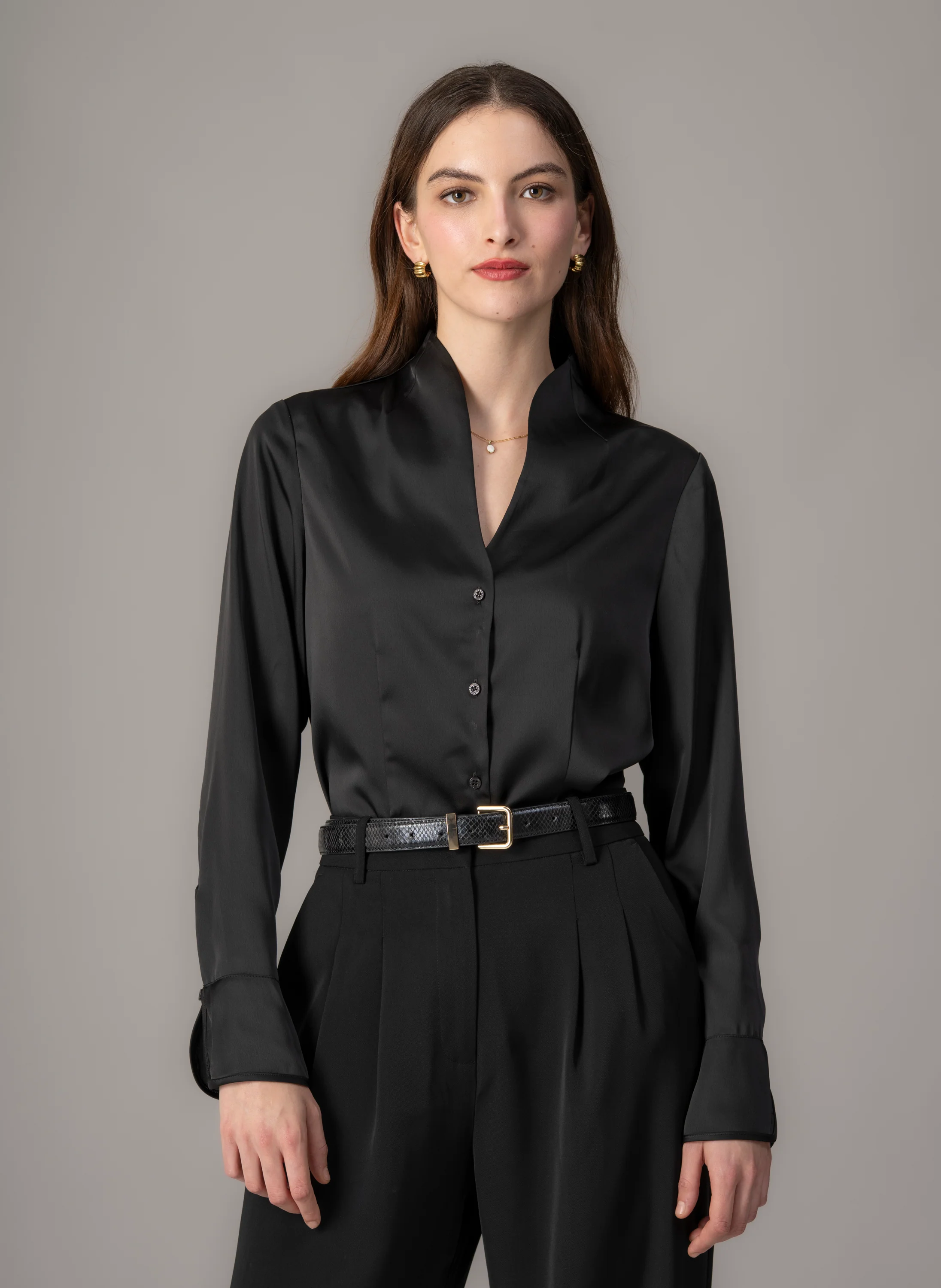 Aria Tailored Fit Tulip Neck Shirt In Black Satin Crepe