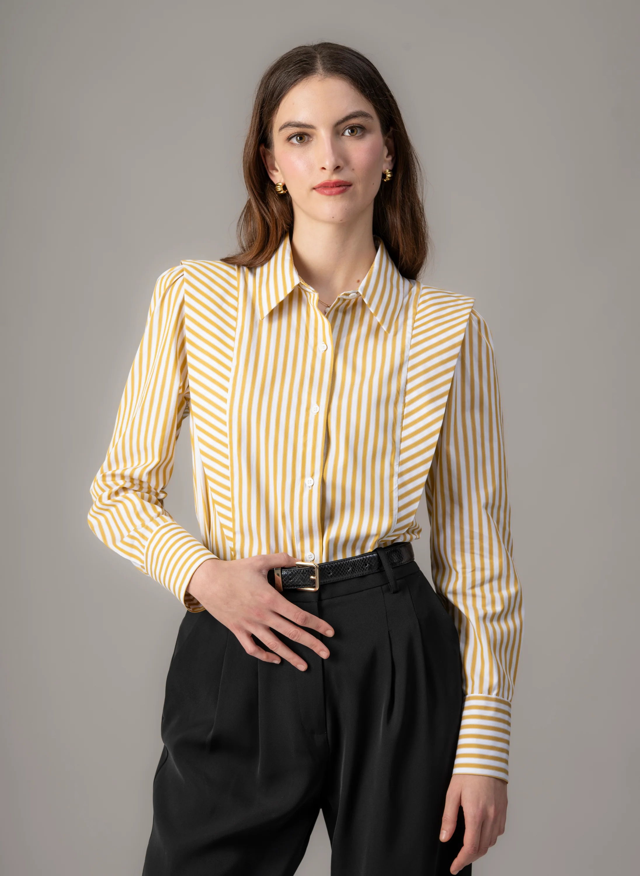 Featuring structured waist-to-shoulder panels, the Brooke blouse offers a sophisticated nod to the 80's while sculpting a flattering trapezoid silhouette that slims the waist and defines the shoulders. Crafted from medium-weight cotton poplin, this crisp blouse boasts precision shirt-making with front and back waist darts and a perfectly structured classic collar.