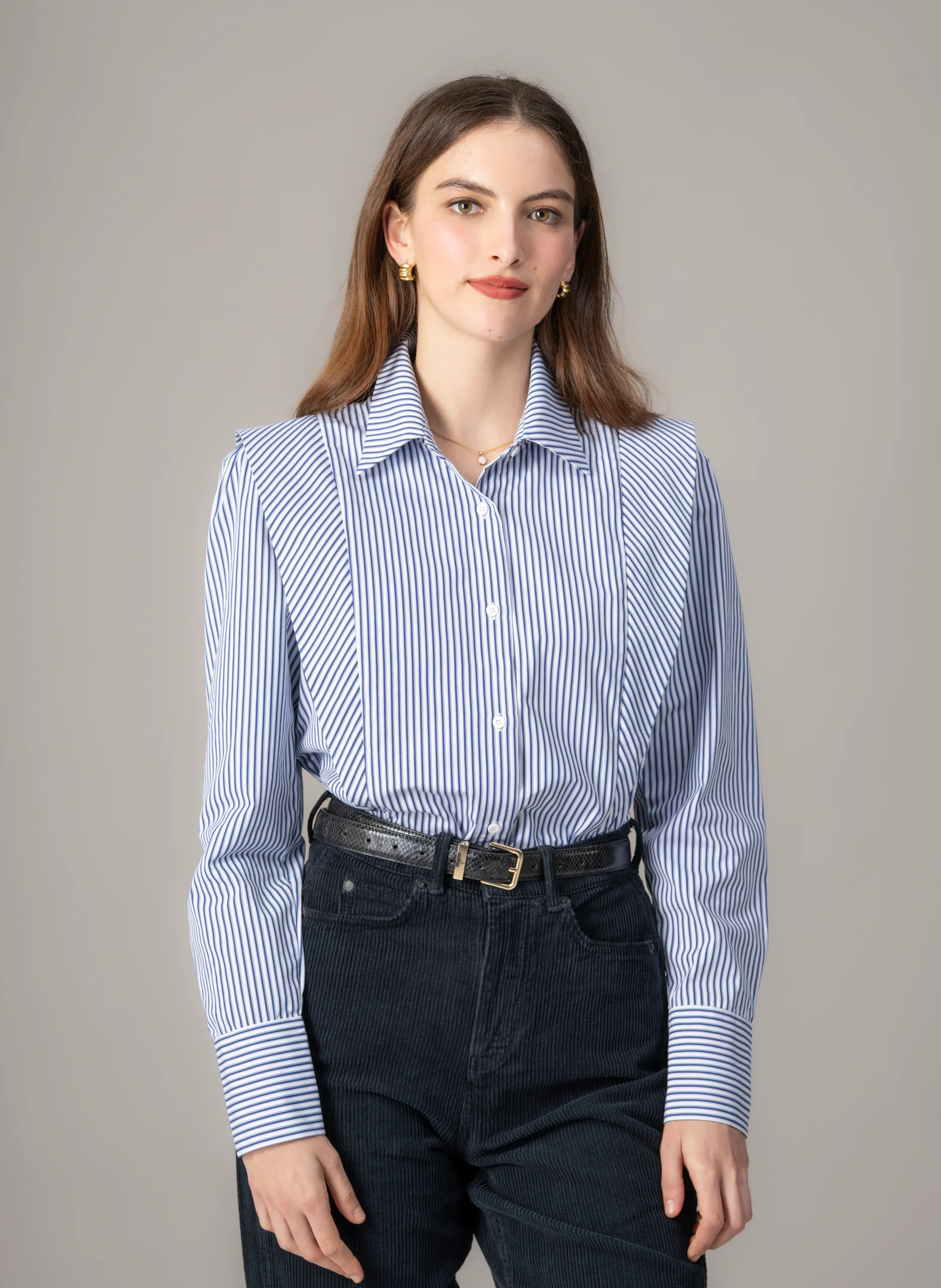 Featuring structured waist-to-shoulder panels, the Brooke blouse offers a sophisticated nod to the 80's while sculpting a flattering trapezoid silhouette that slims the waist and defines the shoulders. Crafted from medium-weight cotton poplin, this crisp striped blouse boasts precision shirt-making with front and back waist darts and a perfectly structured classic collar.