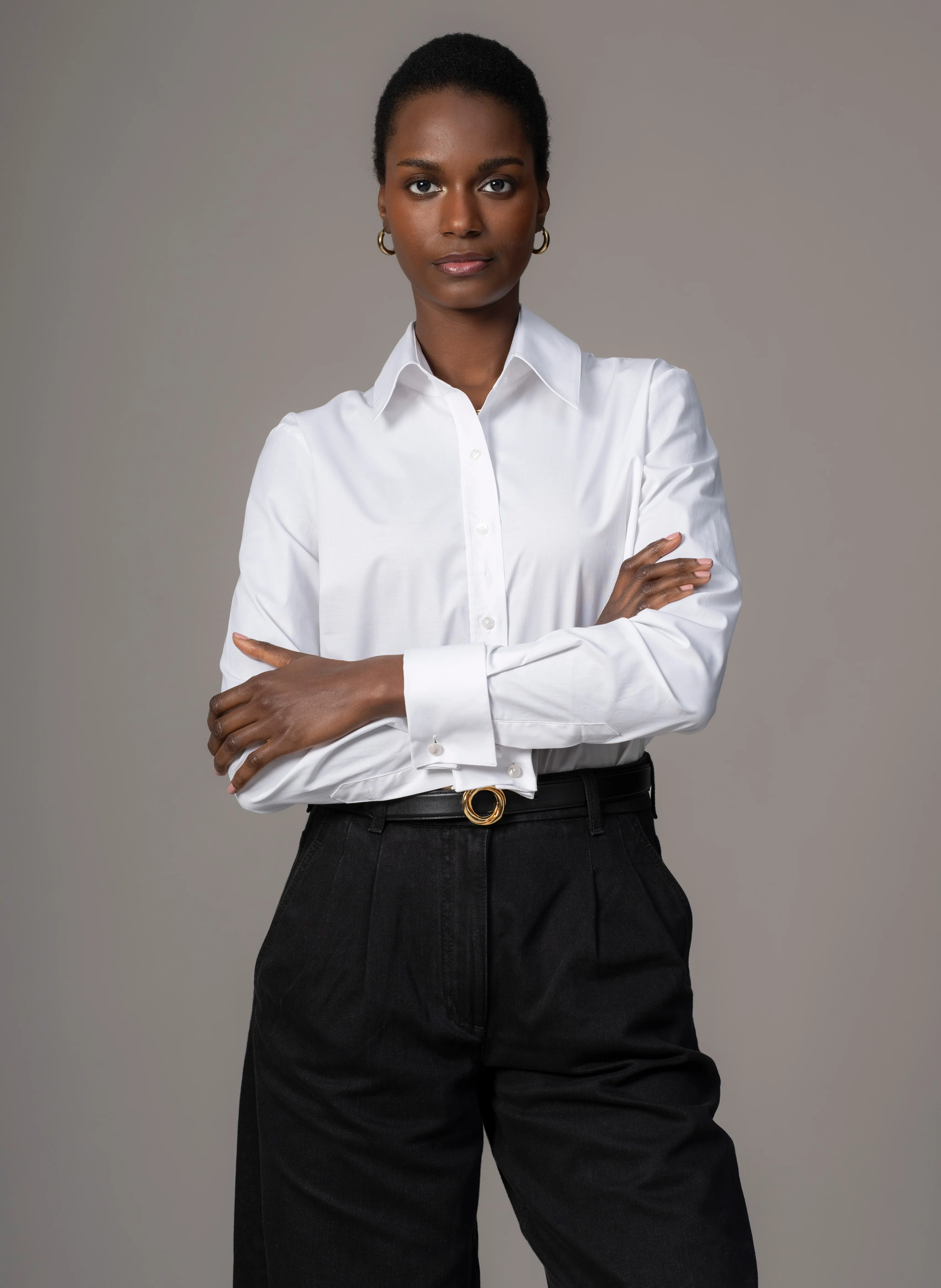 Meet Cameron – a refined twist on our iconic Colleen silhouette, elevated with sharp double cuffs and removable mother-of-pearl cufflinks for a nod to classic menswear. With gently tailored seams, a crisp structured collar, and cuffs that mean business, this is your ultimate go-anywhere shirt.