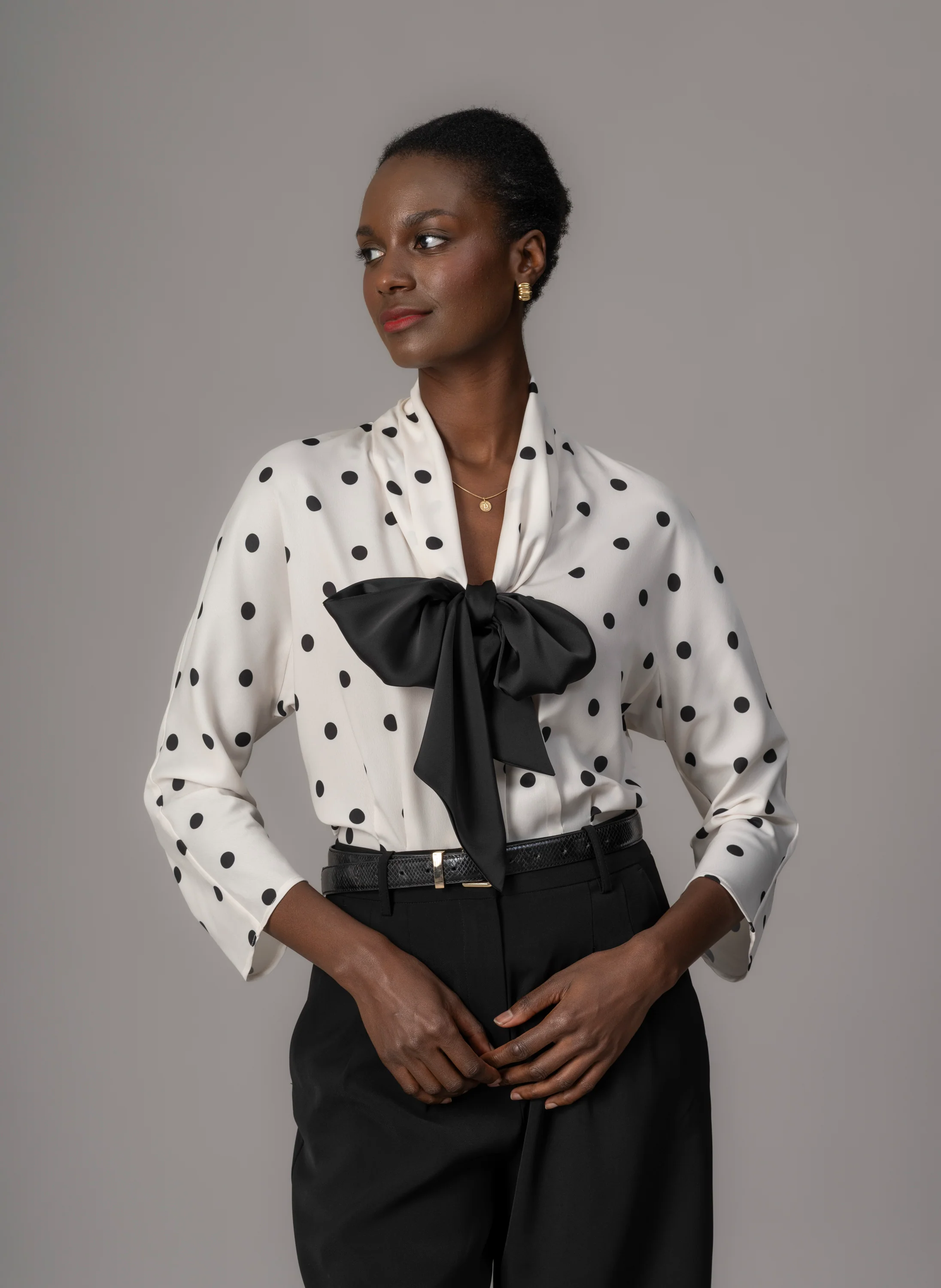 Channel timeless elegance with a playful twist. Inspired by the chic silhouettes of the 1940s, this blouse brings vintage charm into the modern day. Cut from a medium-weight, crease-resistant matte satin, its lively black polka dots and open neckline are finished with a generous pussy bow - perfectly balancing sophistication and whimsy. Soft dolman sleeves create a relaxed yet refined shape, while subtle elbow darts add comfort and movement. A joyful nod to vintage glamour, reimagined for today.