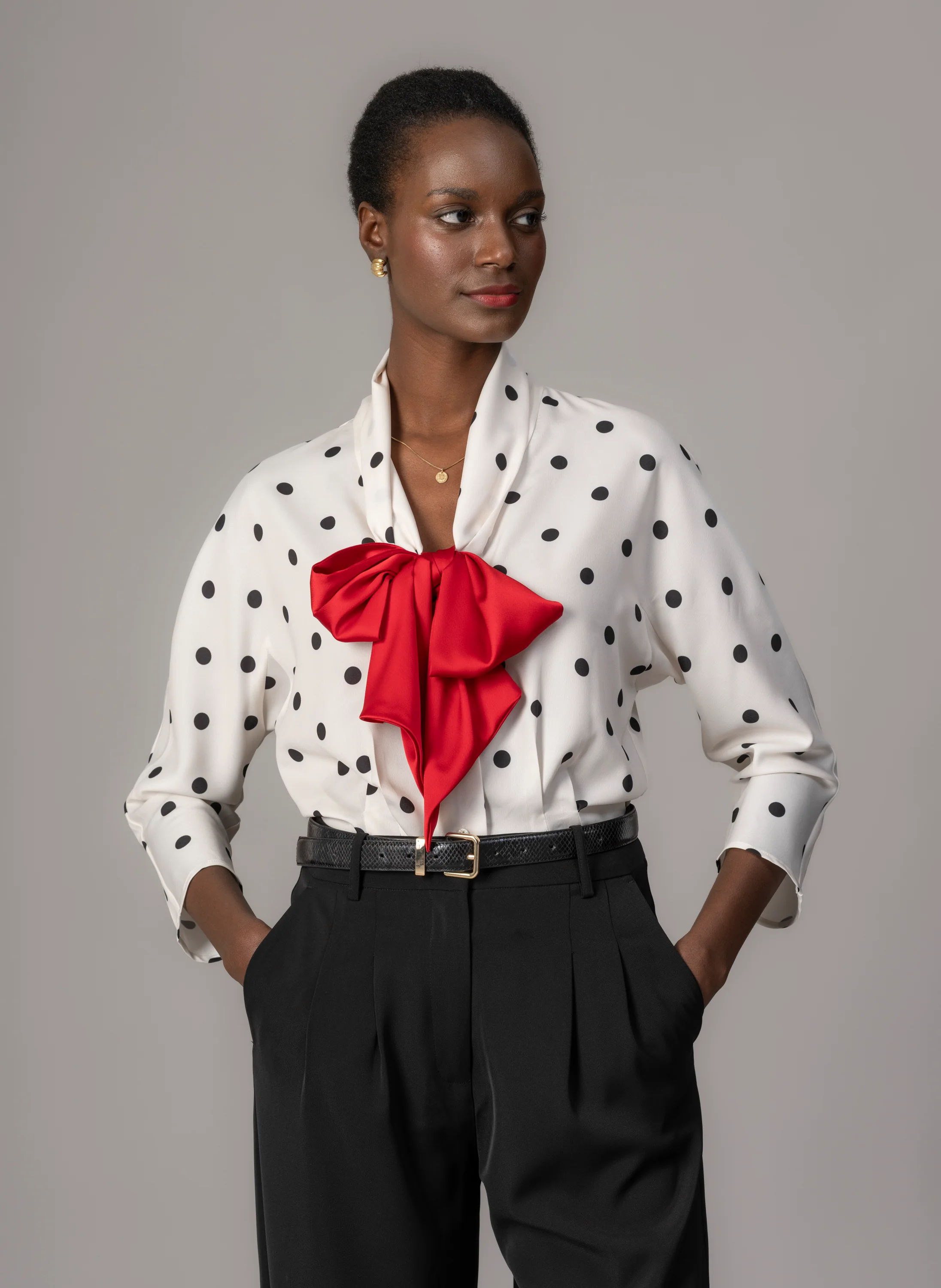 Celeste Tailored Fit Ivory & Black Polka Dot Blouse With Red Bow In Satin Crepe