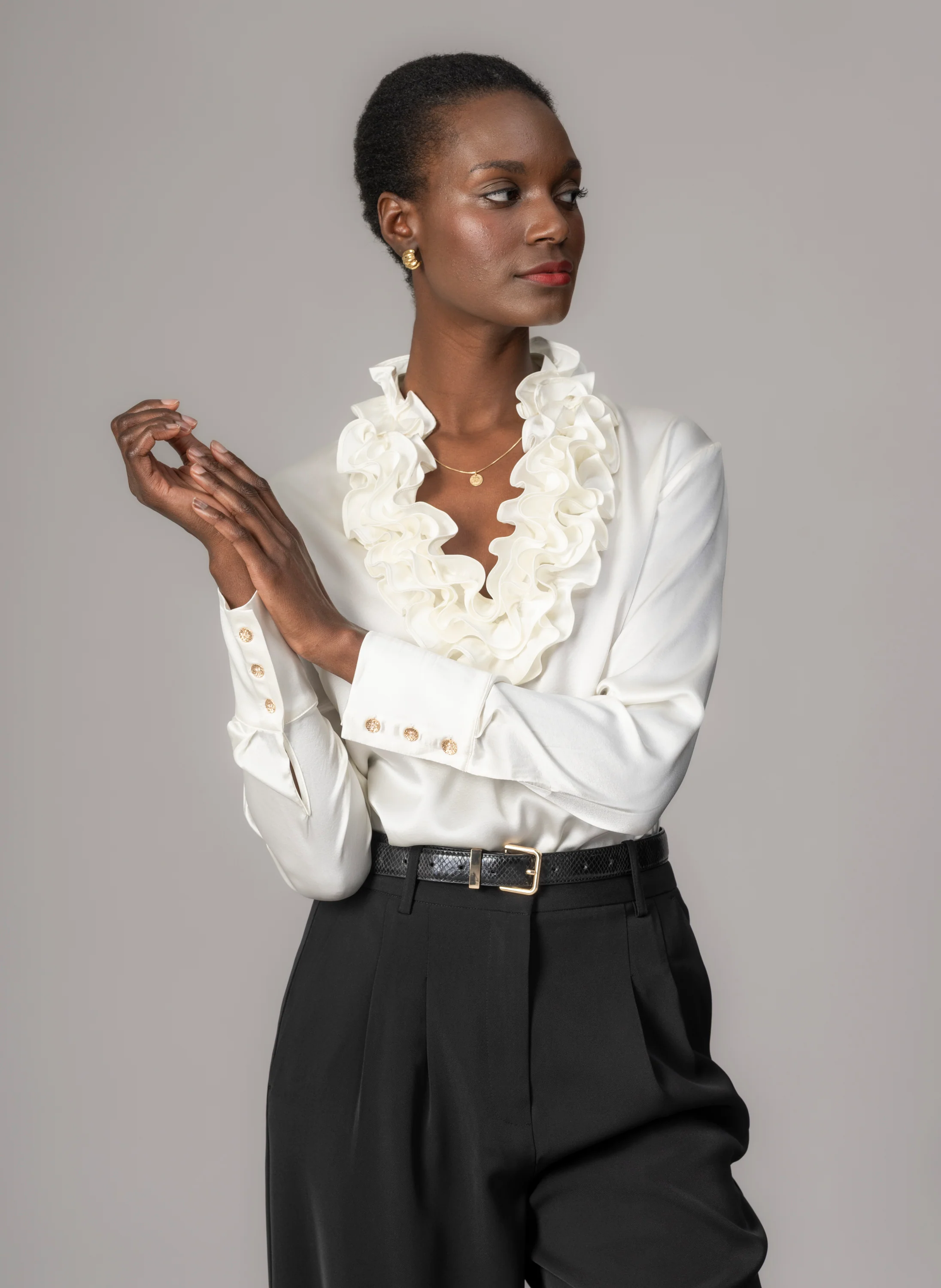 Cut from lustrous silk satin Constance will become your go-to easy wear evening blouse. The sculptural ruffles circulating its neckline elevate the simple silhouette whilst magically framing and flattering all face shapes. Pop Constance on over your head, team with satin trousers or satin midi skirt for an easy evening ensemble.