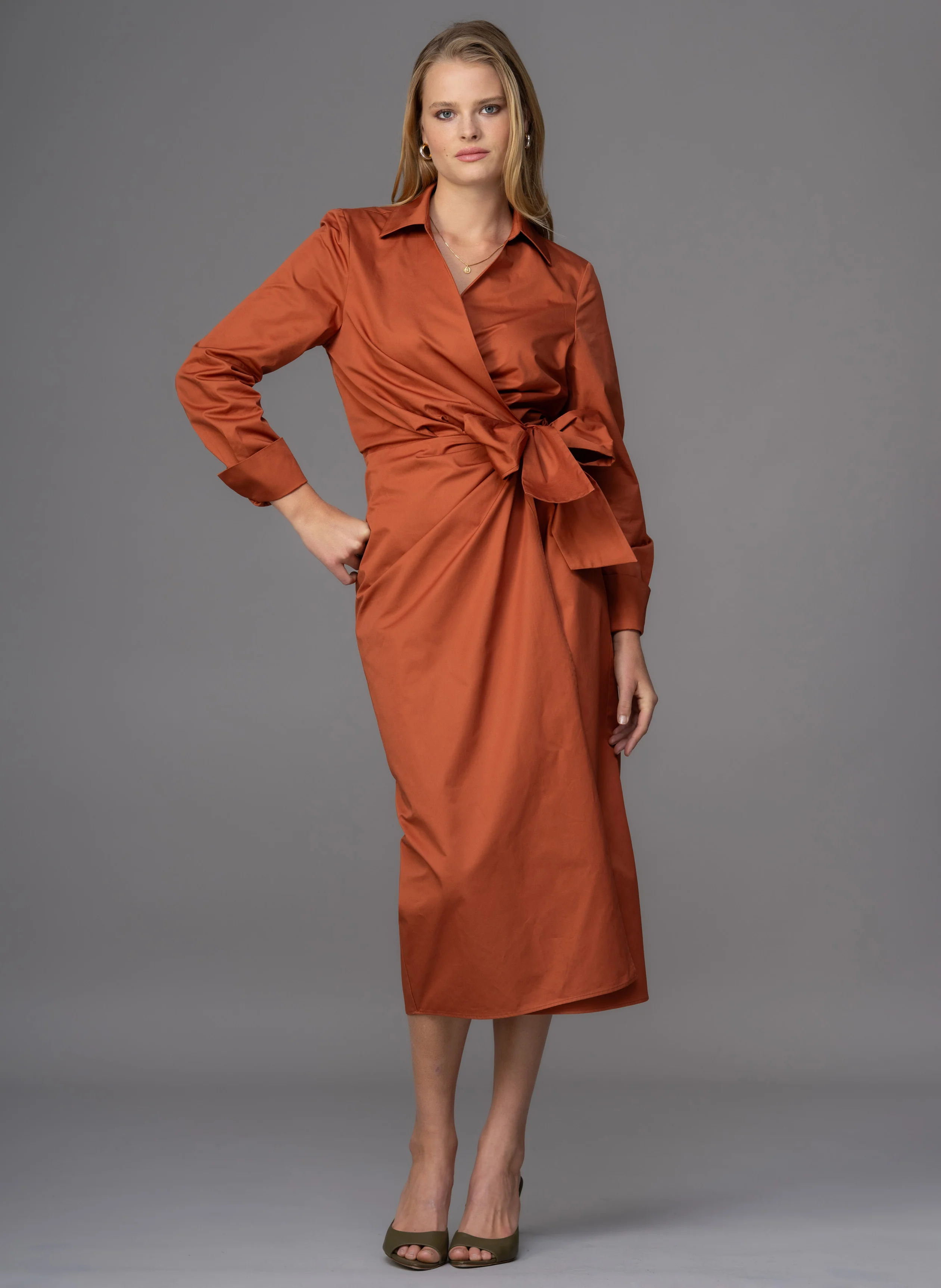 Francine Hourglass Fit Wrap Front Straight Skirt Midi Shirt Dress in Caramel Cotton Sateen