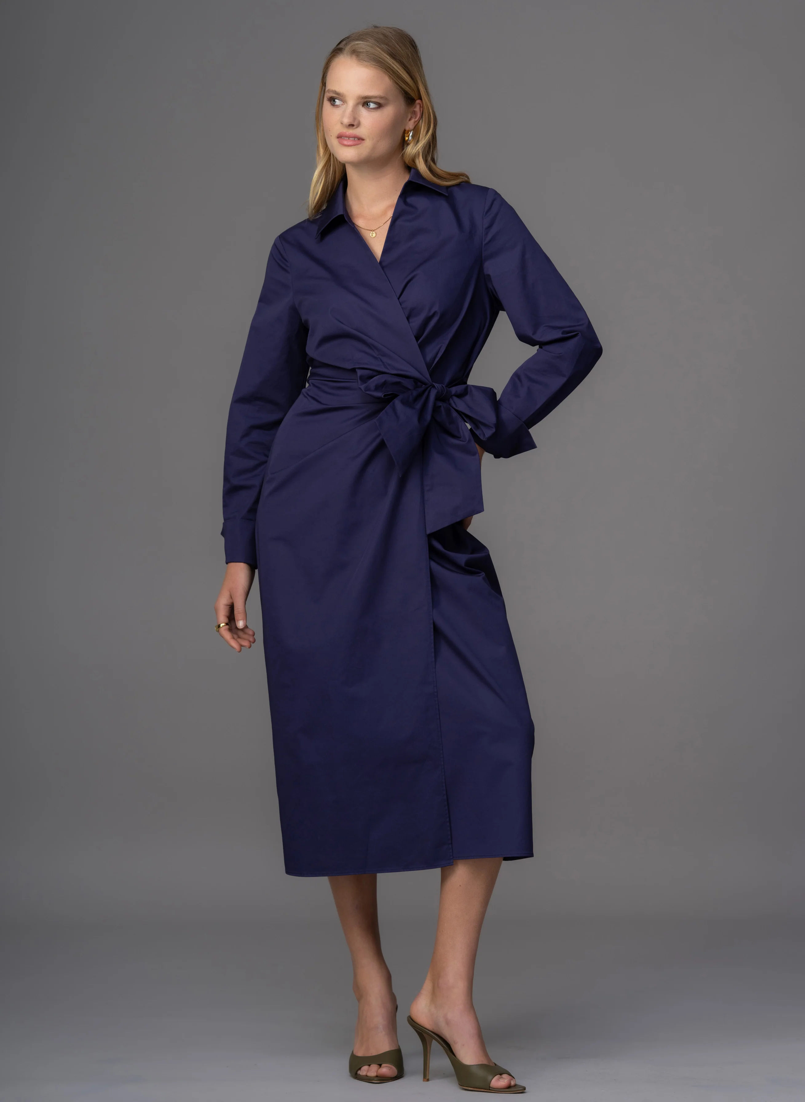 Francine Hourglass Fit Wrap Front Straight Skirt Midi Shirt Dress in Navy Cotton Sateen
