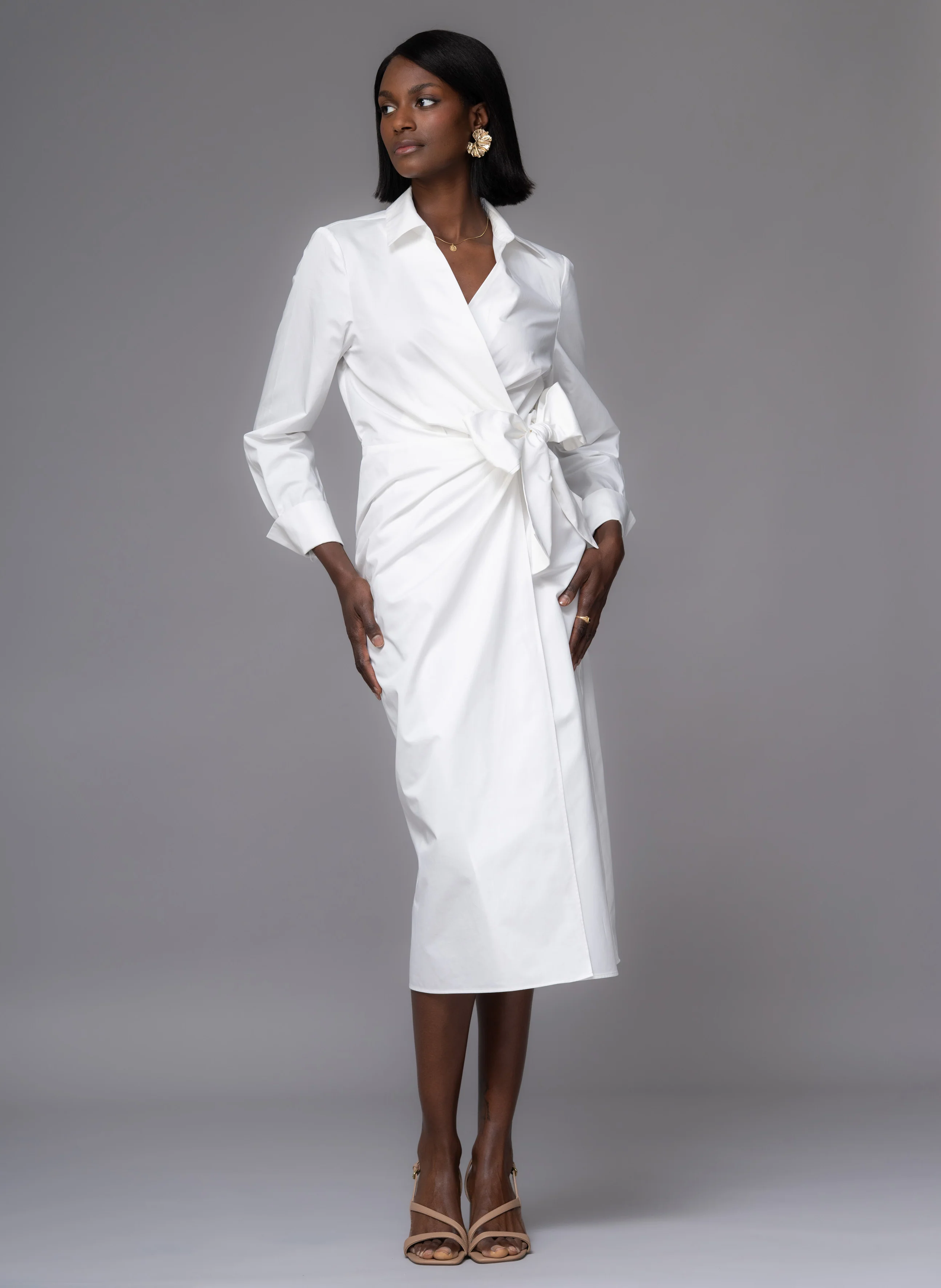 Effortlessly polished and undeniably feminine, Francine is the ultimate one-and-done shirt dress that sculpts, flatters, and turns heads. Designed in lustrous cotton sateen, it features a cleverly cut crossover bodice that sits high to prevent gaping, gathering into a statement bow that cinches the waist and enhances your curves. Versatile cuffs can be worn long or folded for an elegant bracelet-length sleeve. Whether you're commanding the boardroom or attending daytime events, Francine brings sophistication and ease in one striking silhouette.