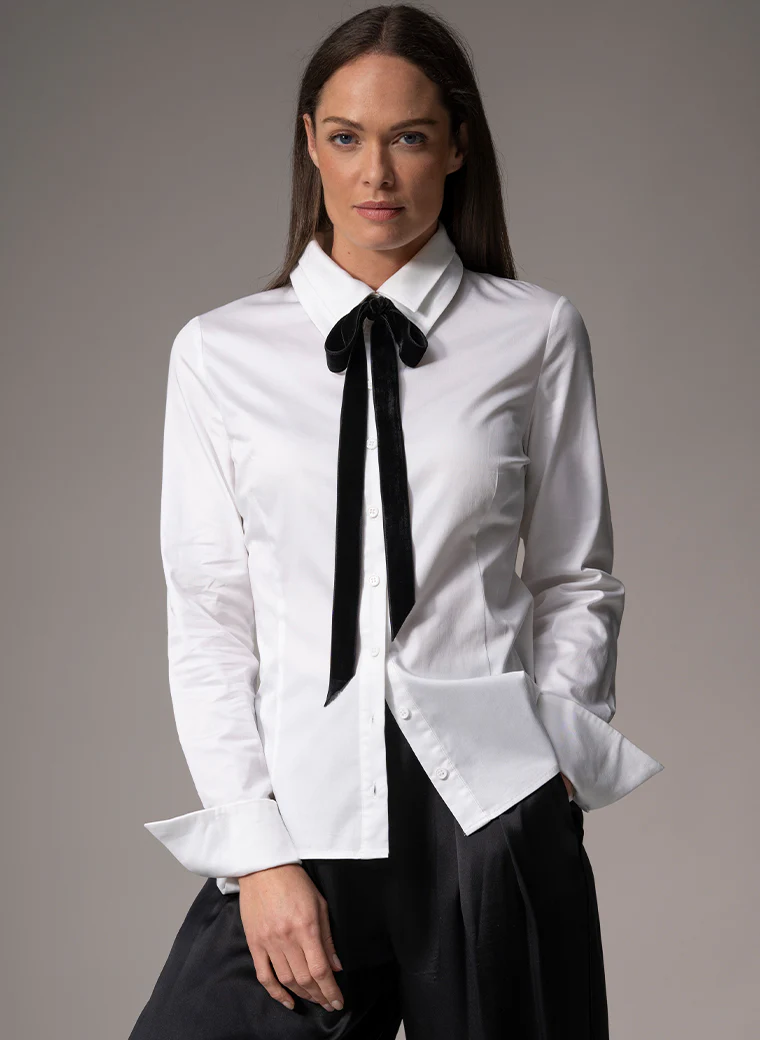 Wear it better than him! Karter is the ultimate 'Le Smoking', 'Boy Meets Girl' bombshell of a shirt! Ever since Marlene Dietrich famously wore a man’s dress suit, ‘Le Smoking’ has symbolised confidence and female sexual empowerment. With its sharply tailored, minimalist lines, topped with a soft black double velvet bow Karter is one cool cat! Its two layer collar with a detachable top collar and detachable velvet bow allows endless styling options.
