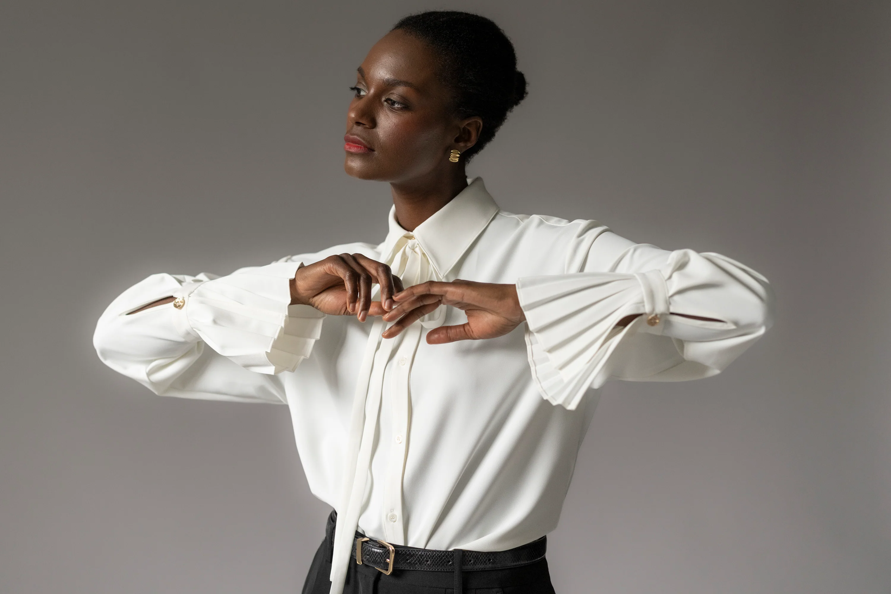 Meet Lottie - effortlessly glamorous with a playful twist. Cut in weighty crease-free crepe, this easy, relaxed-fit blouse makes everyday dressing feel special. The exaggerated pleated cuffs bring drama and charm, designed to peek perfectly from beneath a blazer or coat. Cut long in the body and finished with a classic collar and soft neck tie, Lottie transitions seamlessly from day to evening - the ultimate statement blouse with a touch of whimsy.