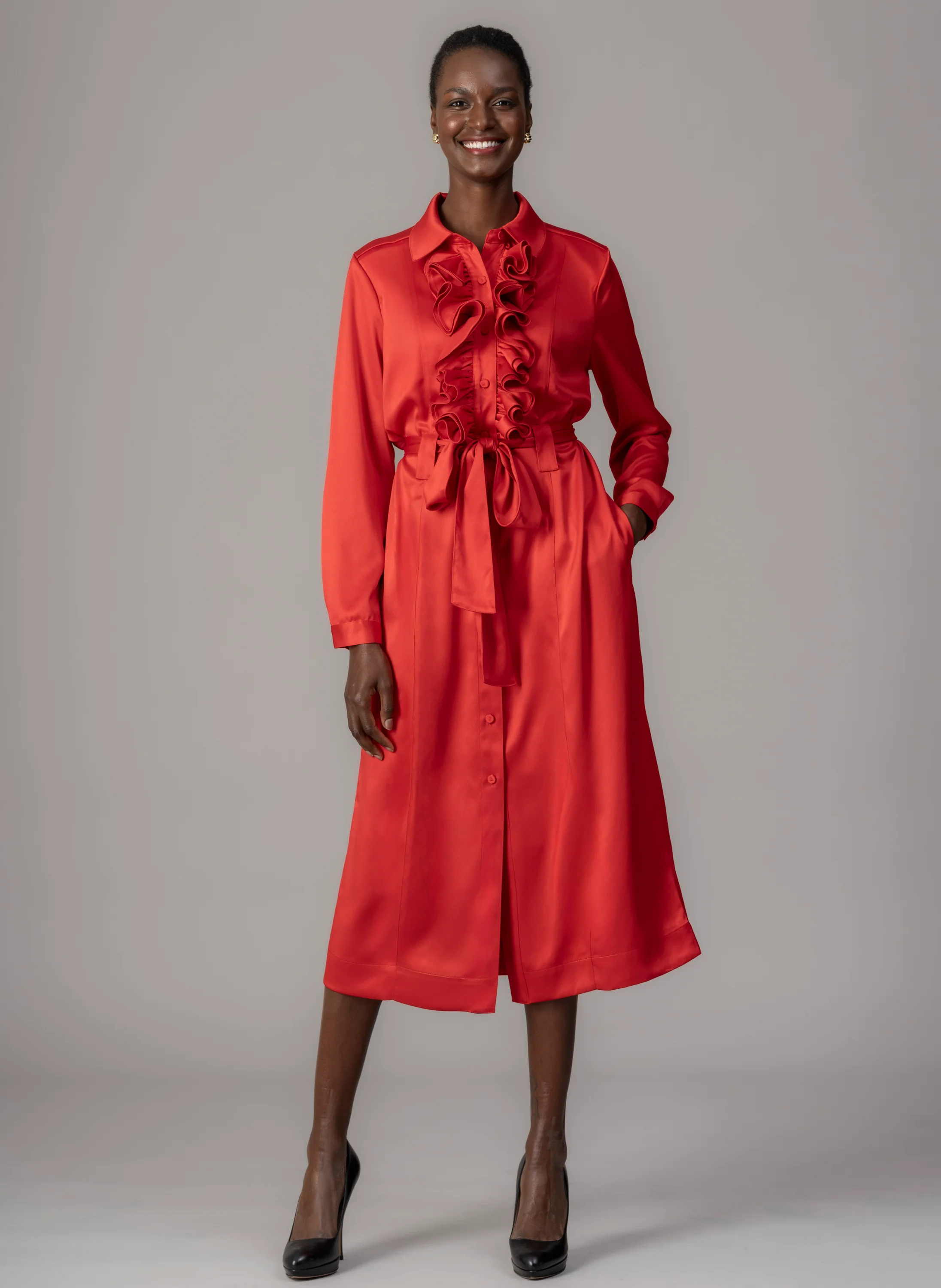 Maria Regular Fit Ruffle Front Midi Shirt Dress In Red Satin Crepe