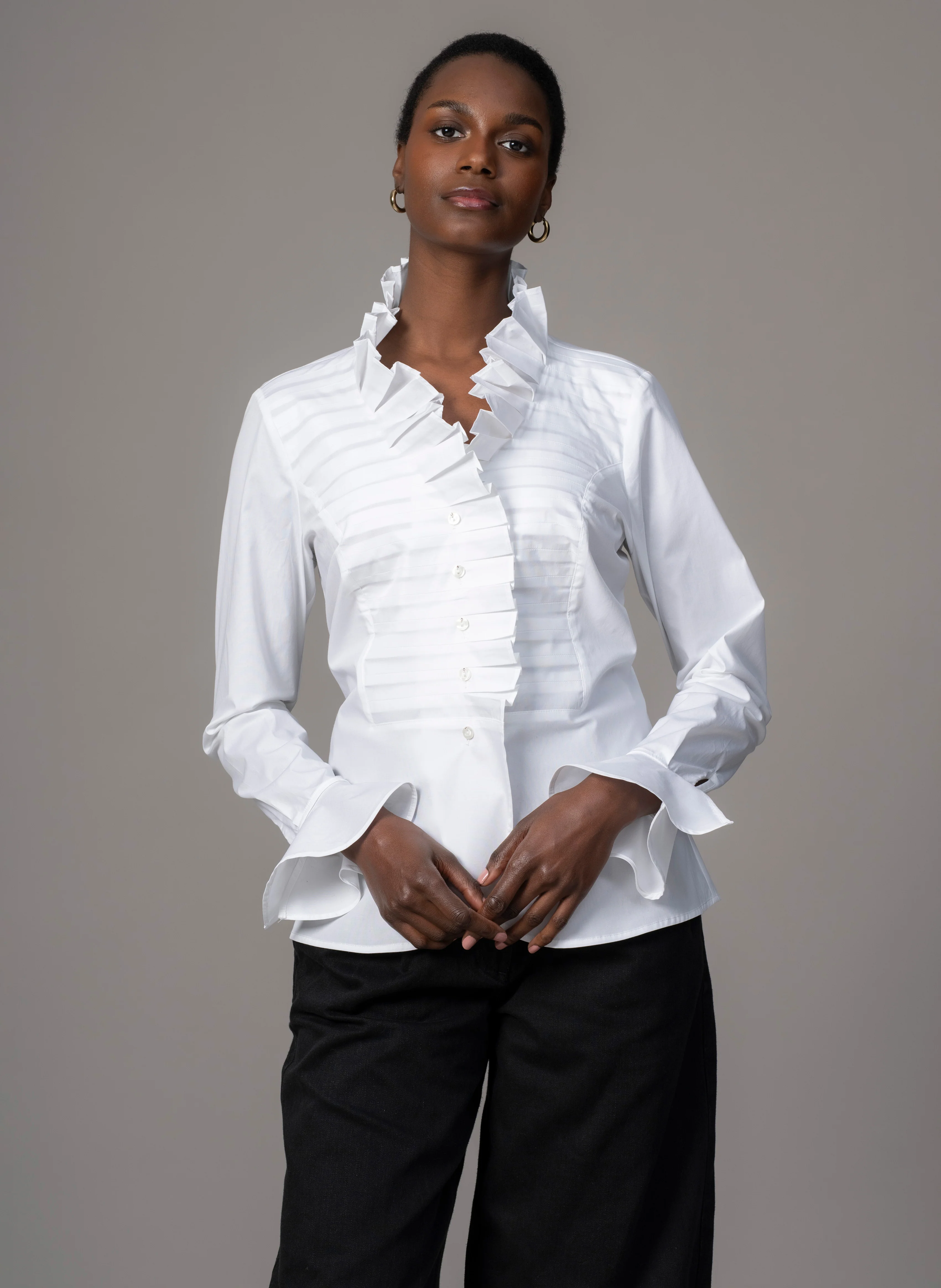 The tuxedo jacket style Suzanna shirt makes a statement day or night with it's dramatic ruffles and circular cuffs. The front panel of gathered ruffles meet in a crescendo at the neckline and are just the thing to add a little drama to a trouser suit. Pair with red lipstick for a bold and feminine look.