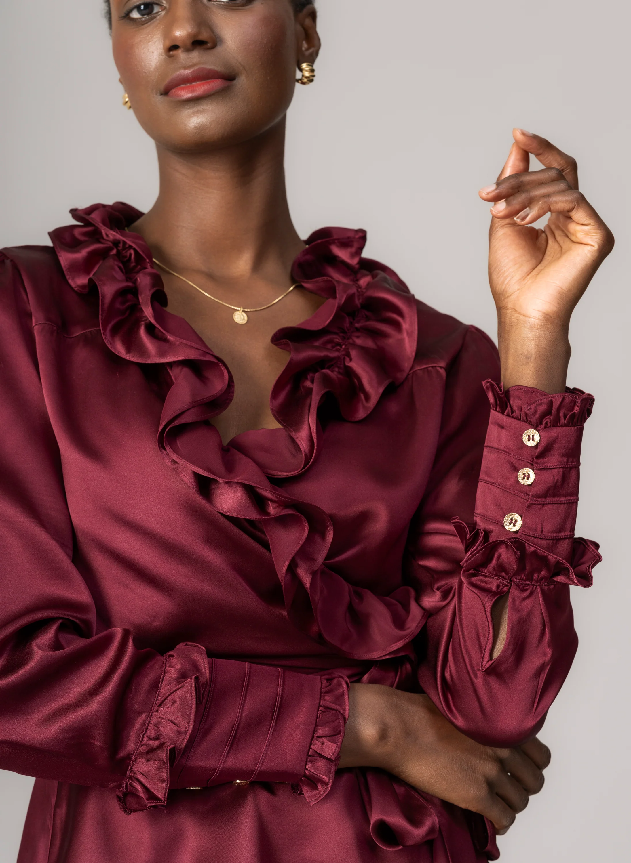 Vera Hourglass Fit Wrap Ruffle Front Blouse In Burgundy Silk Satin