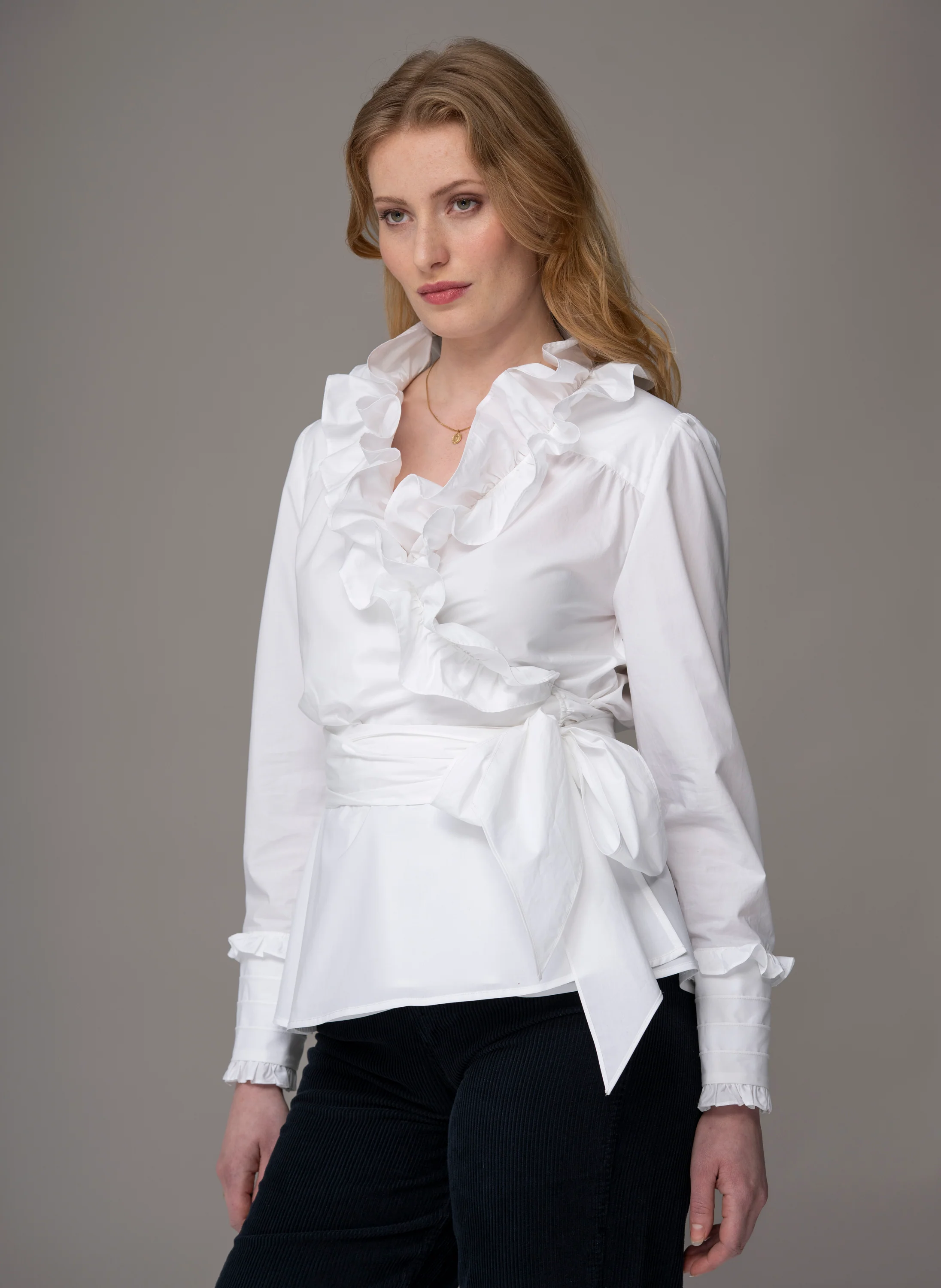 Make an entrance with Vera - a statement-making blouse designed for parties, events, and standout moments. Featuring a dramatic crossover frill front, a beautifully cinched waist, and a generous bow, this flamboyant shirt strikes the perfect balance between femininity and contemporary flair.