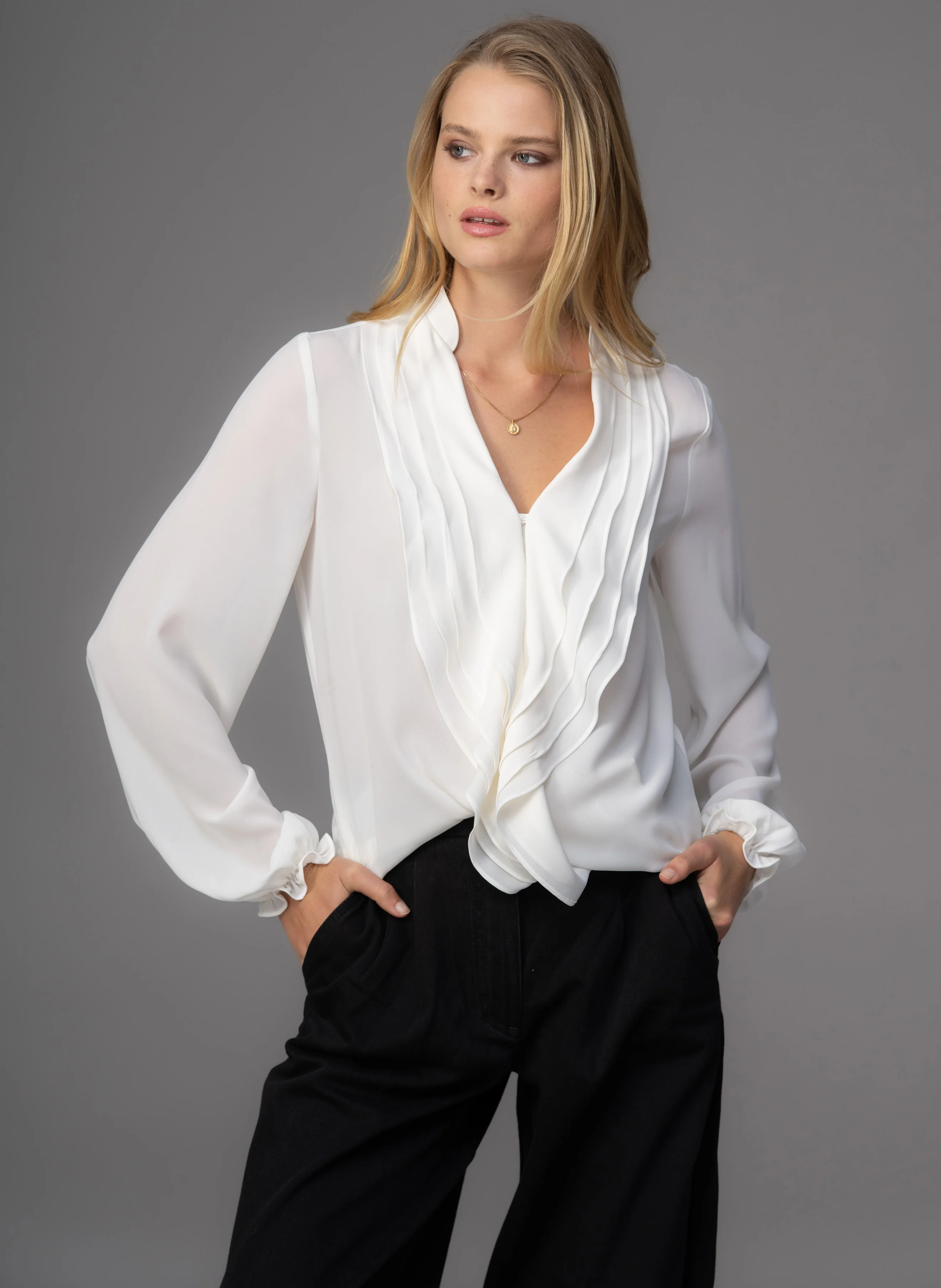 Victoria Easy Fit Ruffle Front Blouse In Ivory Drapey Georgette